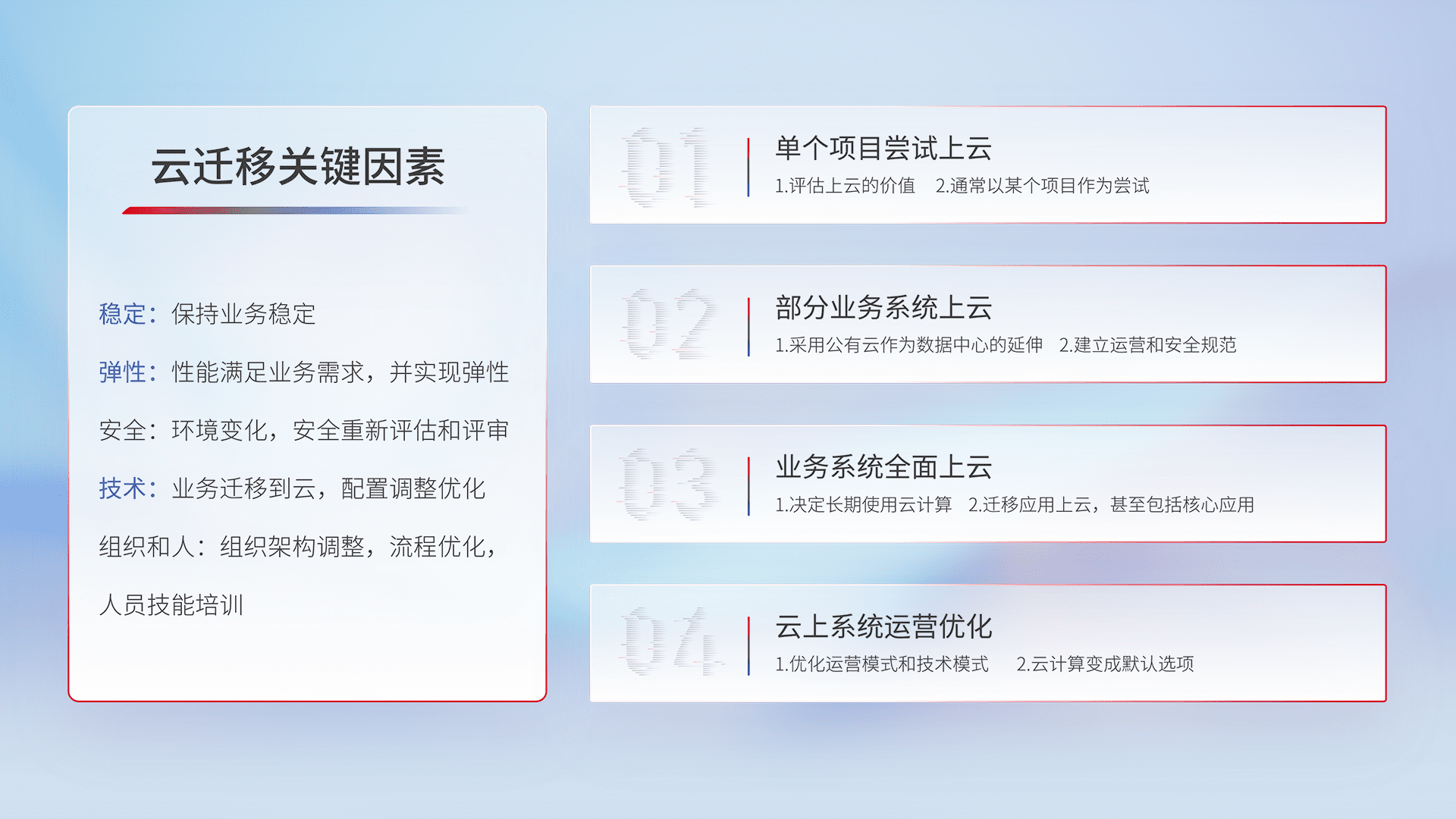 结合实际业务,,,从规划设计、、、云平台选型、、、云原生改造、、、数据迁移、、、集成交付,,,迁移全过程为客户识别最佳上云路径,,做好风险识别管理,,,,设计网络架构、、身份权限、、、安全审计合规、、、、操作审计、、日志审计、、、、监控告警策略、、多站点容灾设计等,,,,对云上基础设施进行整体规划,,,,提升IT治理水平,,,,以满足弹性、、、高可用、、、、高性能的需求。。
