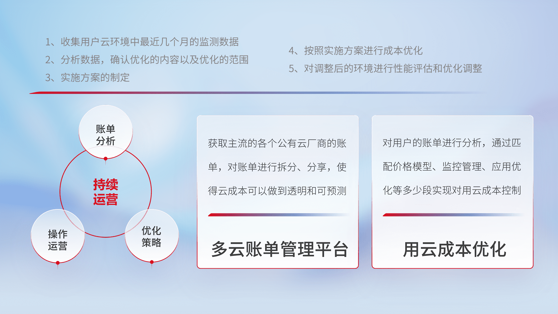 通过多云纳管,,以统一的资源数据模型把客户的云资源进行抽象和封装,,,进而实现对多云资源的统一操作,,保障云资源管理的可靠性、、、、稳定性与可用性。。。。量身定制化运维内容,,配置、、、、开发运维、、、补丁管理、、备份、、、、监控、、、、认证和访问管理、、、审计和日常巡检等,,,保障在用云过程中的可靠度,,,稳定度以及高可用率。。。
